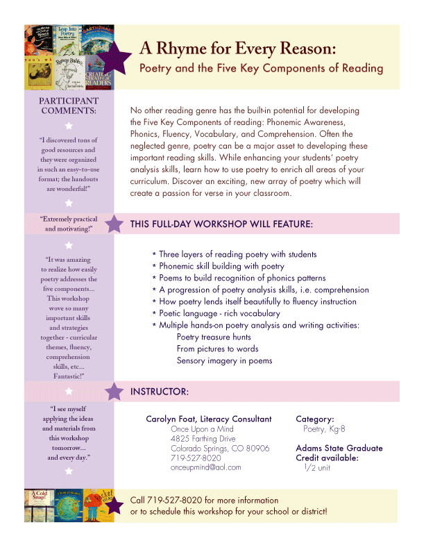 No other reading genre has the built-in potential for developing the Five Key Components of Reading. While enhancing your students’ poetry analysis skills, learn how to use poetry to enrich all areas of your curriculum. Discover an exciting, new array of poetry which will create a passion for verse!
