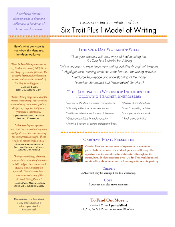 This incredible workshop has already made a dramatic difference in hundreds of Colorado classrooms! Carolyn will energize your teachers with new ways of implementing the Six Traits Plus One Writing Model, highlighting fresh, exciting cross-curricular literature and letting participants experience new writing activities through mini-lessons.
