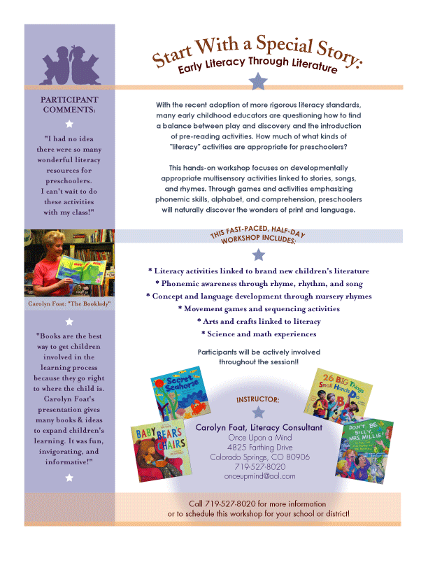 This hands-on workshop focuses on developmentally-appropriate multisensory activities linked to stories, songs, and rhymes. Through games and activities emphasizing phonemic skills, alphabet, and comprehension, preschoolers will naturally discover the wonders of print and language.